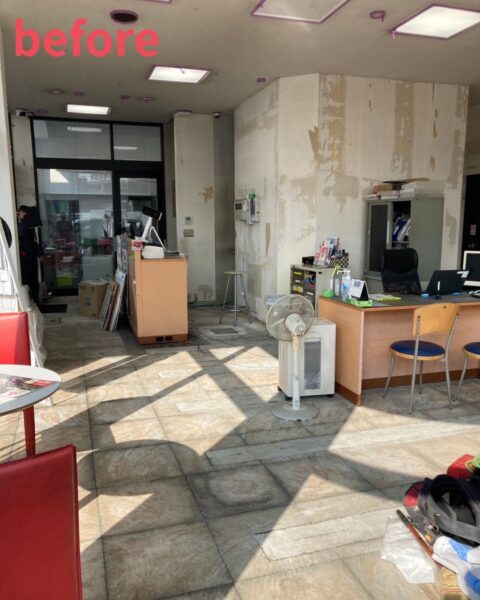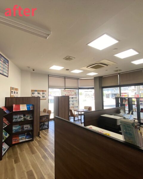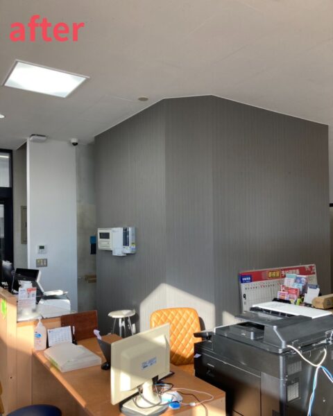 壁については壁紙の貼替を行い、事務所全体の壁はホワイト系のクロスを使用し、カウンター裏の壁はアクセントクロスとしてグレー系のクロスにした上でカウンター台を明るいデザインに変更し、入店した時の事務所について視覚的印象を明るく上質感のある仕上がりなるよう施工しました。