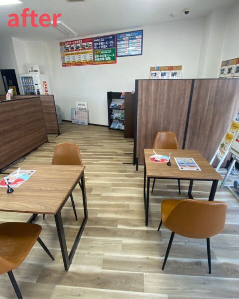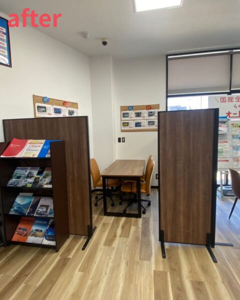 レイアウト変更については、パーテーション(パーティションともいう)新設と撤去、テーブルの交換と位置の変更、自販機の位置変更を行い、事務所内を視覚的にも実用的にも広くなるようにし、落ち着いた感じで商談できるよう、パーテーションの追加や対面の座席配置として使い勝手の向上を実現しております。また、家具の入れ替えを行い、デザインとしても、床、テーブル、パーテーションと木目調で統一し一体感を出してます。