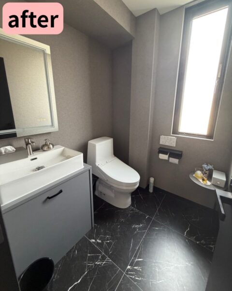 その他、全体の照明器具はダクトレールを採用、トイレスペースはトイレと洗面化粧台を一緒の空間に設置しました。