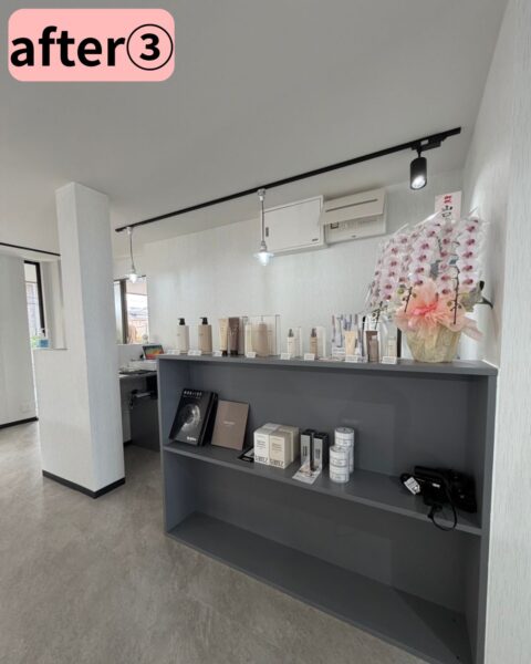 元よりあった柱を生かしてメリハリを持たせつつ、出入りスペース横には美容商品が並べられる棚を設置したことで、機能的でスッキリとした受付スペースになっています。
